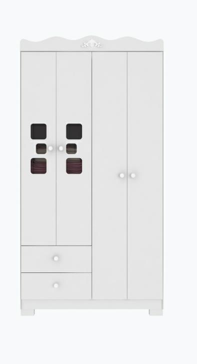 produzido em MDF/MDP com acabamento em pintura UV de alta resistência e Laca PU, o que garante uma maior durabilidade do produto. Com amplo espaço interno, possui 4 portas (com prateleiras e cabideiro) e 2 gavetas com corrediças metálicas. As portas possuem detalhes com vidro temperado incolor, puxadores redondos em polipropileno e, ainda, aplique em resina estilo provençal no rodaforro.