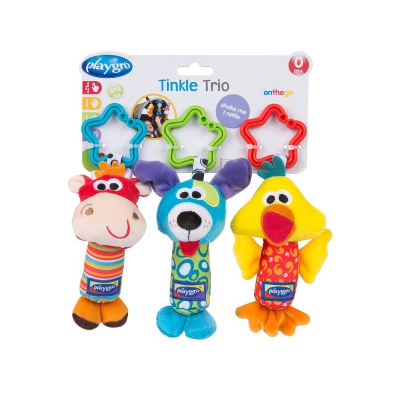 bebê , cadeirinha de carro ou berço. Vaca chocalho, cachorro tilintante e pássaro guinchante ensinam o bebê sobre ação e reação